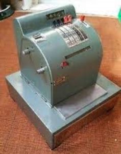 Puis vinrent les caisses manuelles, les anciens se souviennent des « Nationale »de N.C.R. avec ses curseurs placés pour indiquer le montant du débit, (mais ne permettant pas d’additionner plusieurs achats), sa manivelle à tourner qui déclenchait l’impression d’un ticket, l’ouverture du tiroir à espèces, ainsi que le tintement d’une clochette.